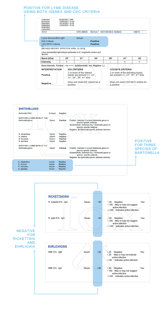 IGeneX tests for Ehrlichia chaffeesis (HME), one of the causative agents of Ehrlichiosis. The same ticks that transmit Lyme disease are known to carry Ehrlichia.